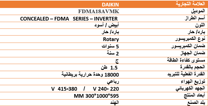 مكيف مخفي دايكن انفيرتر - 1.5 طن - حار\بارد - سعة تبريد 18000
